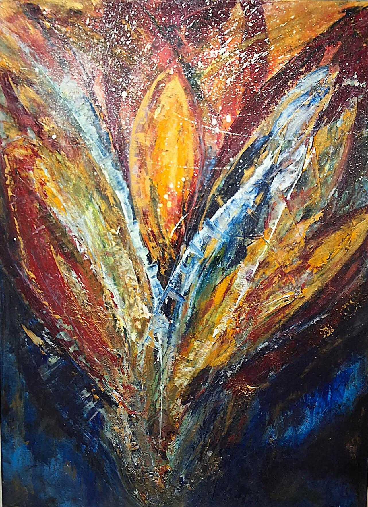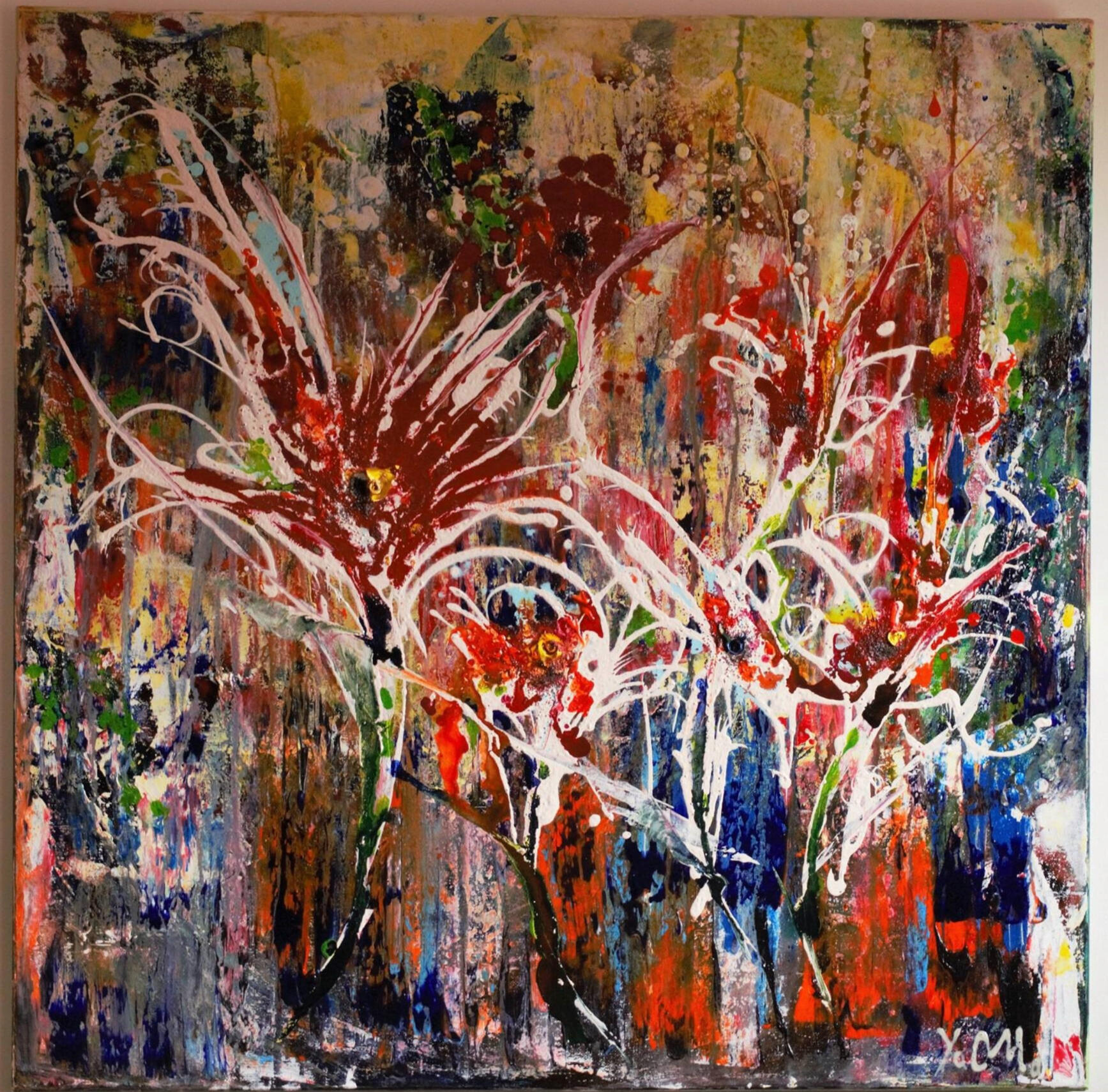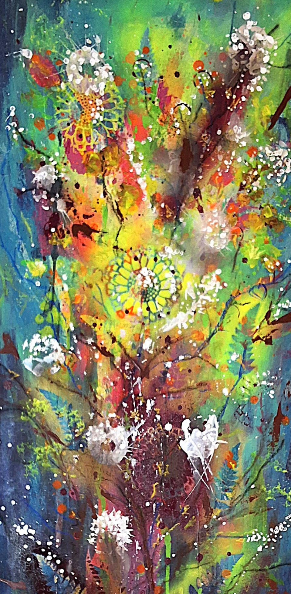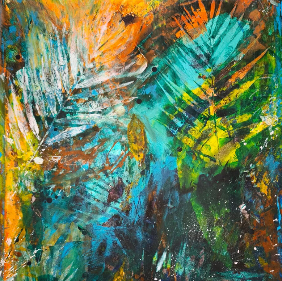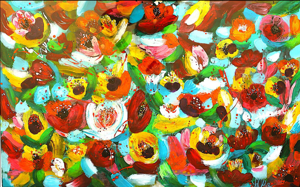 Une peinture abstraite expressive d’inspiration botanique. La nature, les fleurs, les arbres sont mes sujets de prédilection, avec des couleurs vibrantes. Un petit voyage à Giverny dans les jardins de Monet est aussi à l’origine d’un regain pour cette matière infinie.